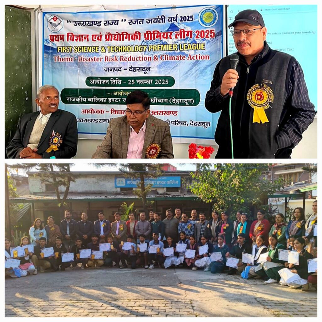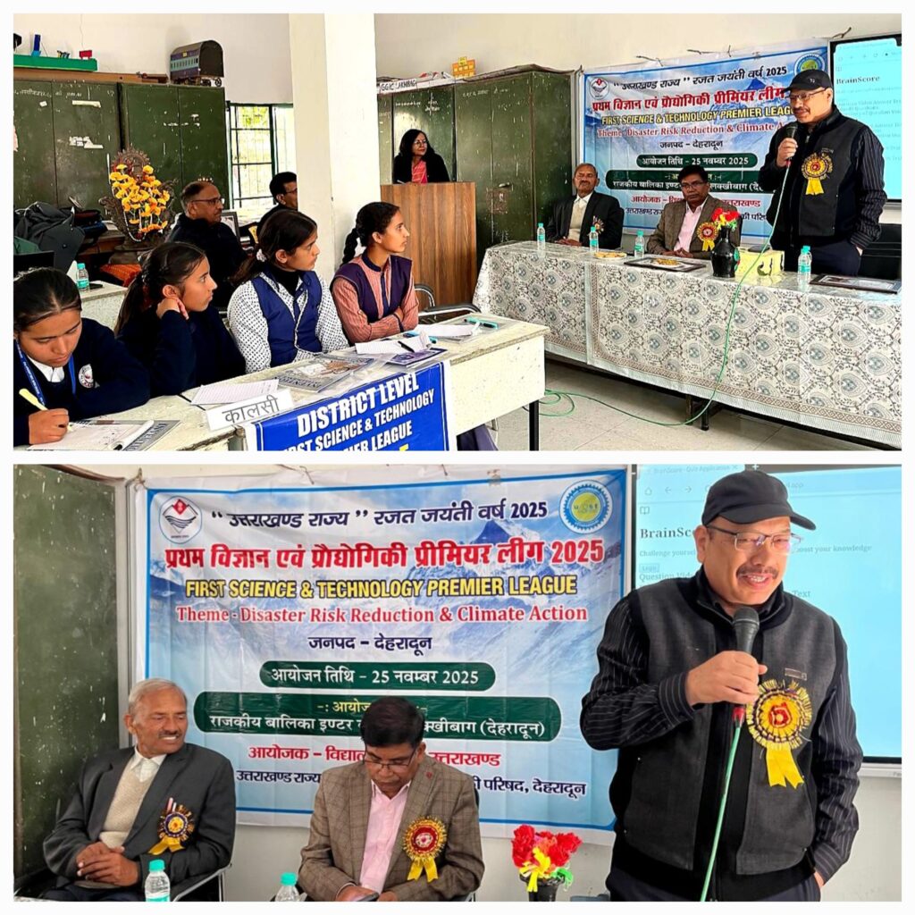 आज दिनांक 26 नवम्बर 2025 को उत्तराखंड विज्ञान एवं प्रौद्योगिकी परिषद (यूकॉस्ट) के तत्वाधान में जनपद स्तरीय प्रथम विज्ञान एवं प्रौद्योगिकी प्रीमियर लीग 2025 का आयोजन जनपद समन्वयक राम आसरे चौहान के संयोजन में राजकीय बालिका इंटर कॉलेज लक्खी बाग देहरादून में किया गया । बतौर मुख्य अतिथि मुख्य शिक्षा अधिकारी देहरादून विनोद कुमार दौंढ़ियाल विशिष्ट अतिथि डॉ० राकेश जुगरान पूर्व प्राचार्य जिला शिक्षा एवं प्रशिक्षण संस्थान देहरादून, संयोजक प्रधानाचार्य नीरज छिब्बर के द्वारा मां शारदे के चित्र का अनावरण करते हुए दीप प्रज्वलन कर किया गया। राजकीय बालिका इंटर कॉलेज लक्खी बाग की छात्राओं द्वारा मां शारदे वंदना तथा विभिन्न विकासखंड से आए हुए प्रतिभागी छात्र-छात्राओं मार्गदर्शक शिक्षकों एवं अतिथियों के स्वागत सम्मान में स्वागत गीत प्रस्तुत किया। विशिष्ट अतिथि डॉ० राकेश जुगरान ने छात्र-छात्राओं को संबोधित करते हुए विज्ञान तथा मानव सभ्यता के विकास में सम्बन्ध तथा विकास के विभिन्न चरणों में विज्ञान की भूमिका प्रस्तुत करते हुए विज्ञान कविता के माध्यम से न्यूटन के द्वारा खोजे गए गुरुत्वाकर्षण नियम , क्रिया- प्रतिक्रिया के नियम, कॉपरनिकस के द्वारा सौरमंडल में ग्रहों की गति इत्यादि पर छात्र-छात्राओं का मार्गदर्शन किया एवं क्षेत्र एवं समाज के विकास के लिए विज्ञान विज्ञान के सकारात्मक उपयोग पर बल दिया। कार्यक्रम के मुख्य अतिथि मुख्य शिक्षा अधिकारी जनपद देहरादून विनोद कुमार ढौंढ़ियाल ने छात्र-छात्राओं का प्रत्येक संभावित मंच पर बढ़-चढ़कर उपयोग करते हुए अपनी प्रतिभाओं को निखारने का हेतु प्रेरित किया तथा कहा कि हमारी सोच सदैव सकारात्मक होनी चाहिए, हमारा स्वभाव सदैव सरल होना चाहिए, हमारी भाषा बहुत विनम्र एवं मृदु होनी चाहिए क्योंकि विनम्रता ही मानव का सबसे बड़ा आभूषण है।