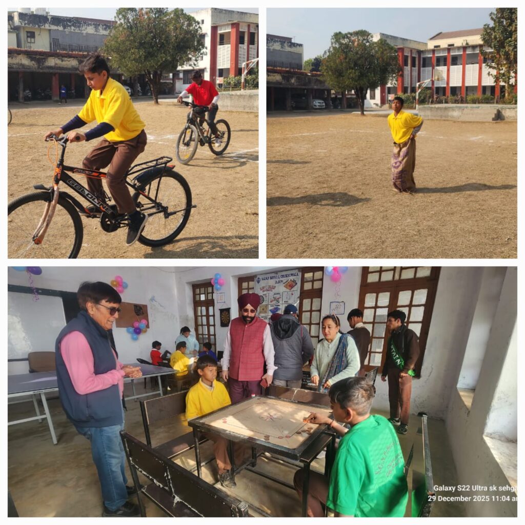 तीन दिवसीय इस खेल प्रतियोगिता में विद्यालय के चारों सदनों—रणजीत सिंह हाउस, उधम सिंह हाउस, भगत सिंह हाउस एवं महाराणा प्रताप हाउस—के विद्यार्थियों ने पूरे उत्साह, अनुशासन एवं जोश के साथ प्रतिभाग किया। आउटडोर खेल प्रतियोगिताओं में जूनियर वर्ग के लिए चम्मच रेस, बुक बैलेंस रेस एवं मेंढक रेस जैसी रोचक प्रतियोगिताएं आयोजित की गईं, जिनमें नन्हे विद्यार्थियों ने अपनी फुर्ती और संतुलन क्षमता का प्रदर्शन किया।